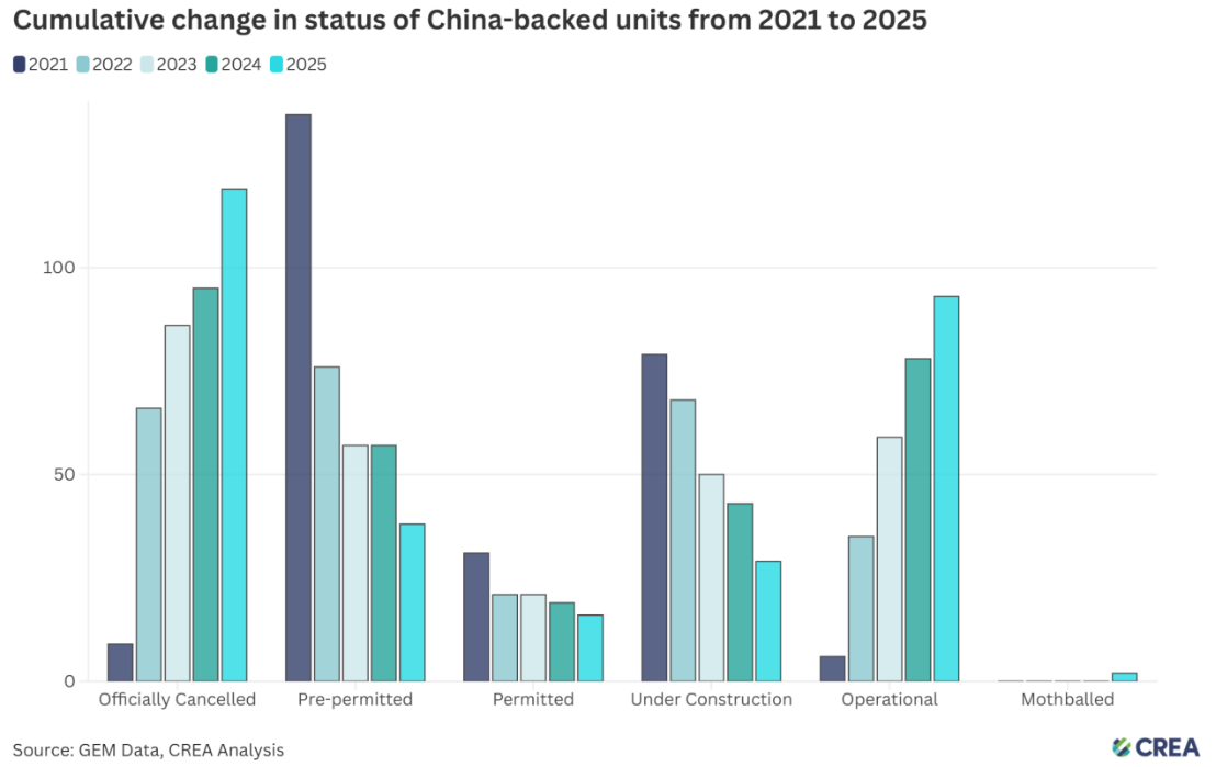 2021至2025年中资参与海外煤电项目状态的累计变化趋势